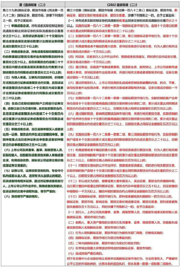 关于操纵证券、期货市场行为,原《追诉标准(二)》实施后,2019年7月1日,《最高人民法院、最高人民检察院关于办理操纵证券、期货市场刑事案件适用法律若干问题的解释》(下称“《操纵刑事解释》”)实施,较之2017年11月实施的《刑法修正案(十)》,《操纵刑事解释》新增了操纵证券、期货市场行为模式,并明确“情节严重”及“情节特别严重”情形等标准。随后,新《证券法》、《刑法修正案(十一)》均以法律的形式新增了操纵证券市场行为模式。关于追诉标准,《2022追诉标准(二)》在较大范围参考《操纵刑事解释》“情节严重”情形,作为立案追诉标准。